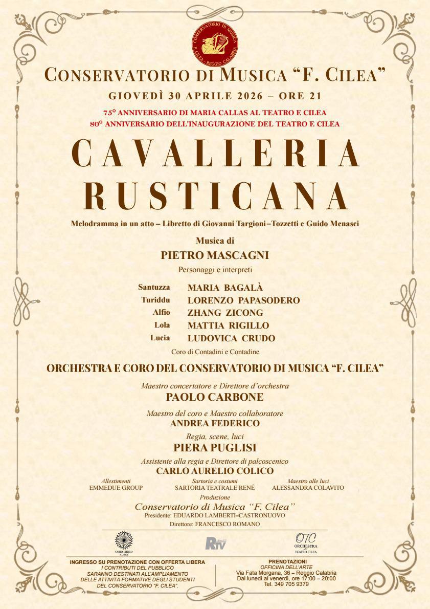 gli studenti del nostro Conservatorio eseguiranno "Cavalleria rusticana" di Pietro Mascagni celebrando due anniversari: il 75° dell’unica apparizione di Maria Callas al Teatro F. Cilea di Reggio Calabria e l’80° dell’inaugurazione di quest’ultimo (1946).